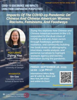 This event is part of the 2025-2026 lecture series "COVID-19 Governance and Impacts: China from Comparative Perspectives." The series will be part of the China COVID Project, a multi-institutional, interdisciplinary research initiative funded by the Henry Luce Foundation. It aims to spotlight new empirical and theoretical research that interrogates China’s post-COVID standing through social, economic, political, and gender-based lenses. It features scholars working on governance, public health, digital statecraft, labor, gender, and civil society responses in China and Asia. The series will foster public dialogue and contribute to documentation and analysis of the pandemic’s legacy.