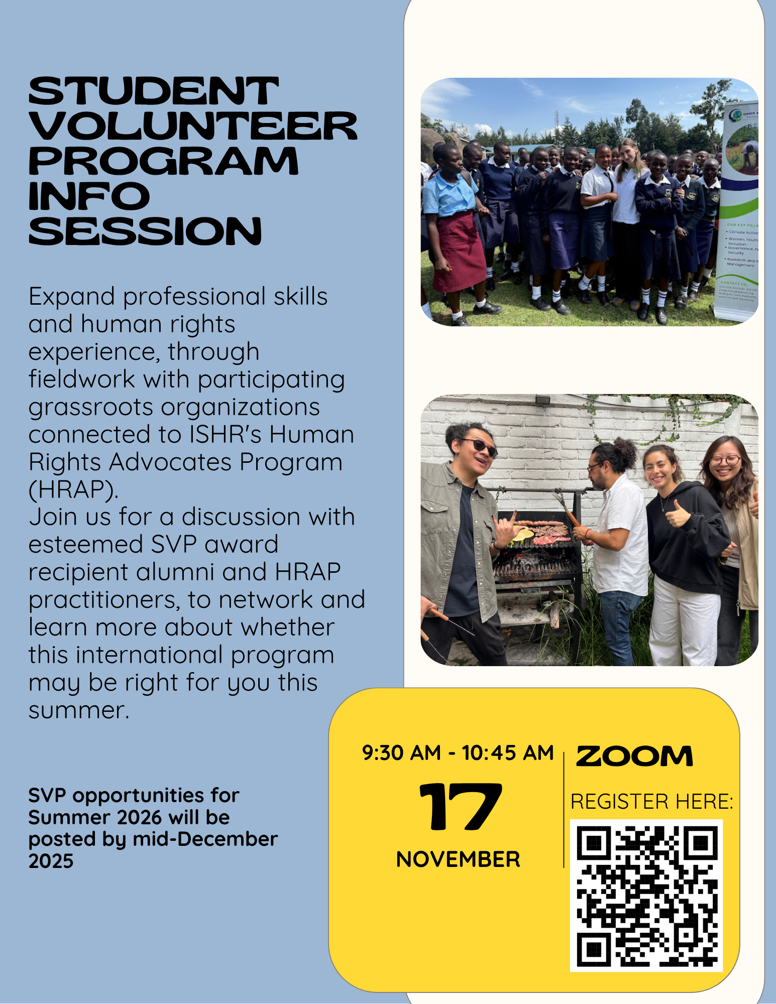 Monday, November 17 | 9:30-10:45 ESTOnlineExpand professional skills and human rights experience, through fieldwork with participating grassroots organizations connected to ISHR’S Human Rights Advocates Program (HRAP). Join us for a discussion with esteemed SVP award recipient alumni and HRAP practitioners, to network and learn moore about whether this international program may be right for you this summer. Register belowEvent link