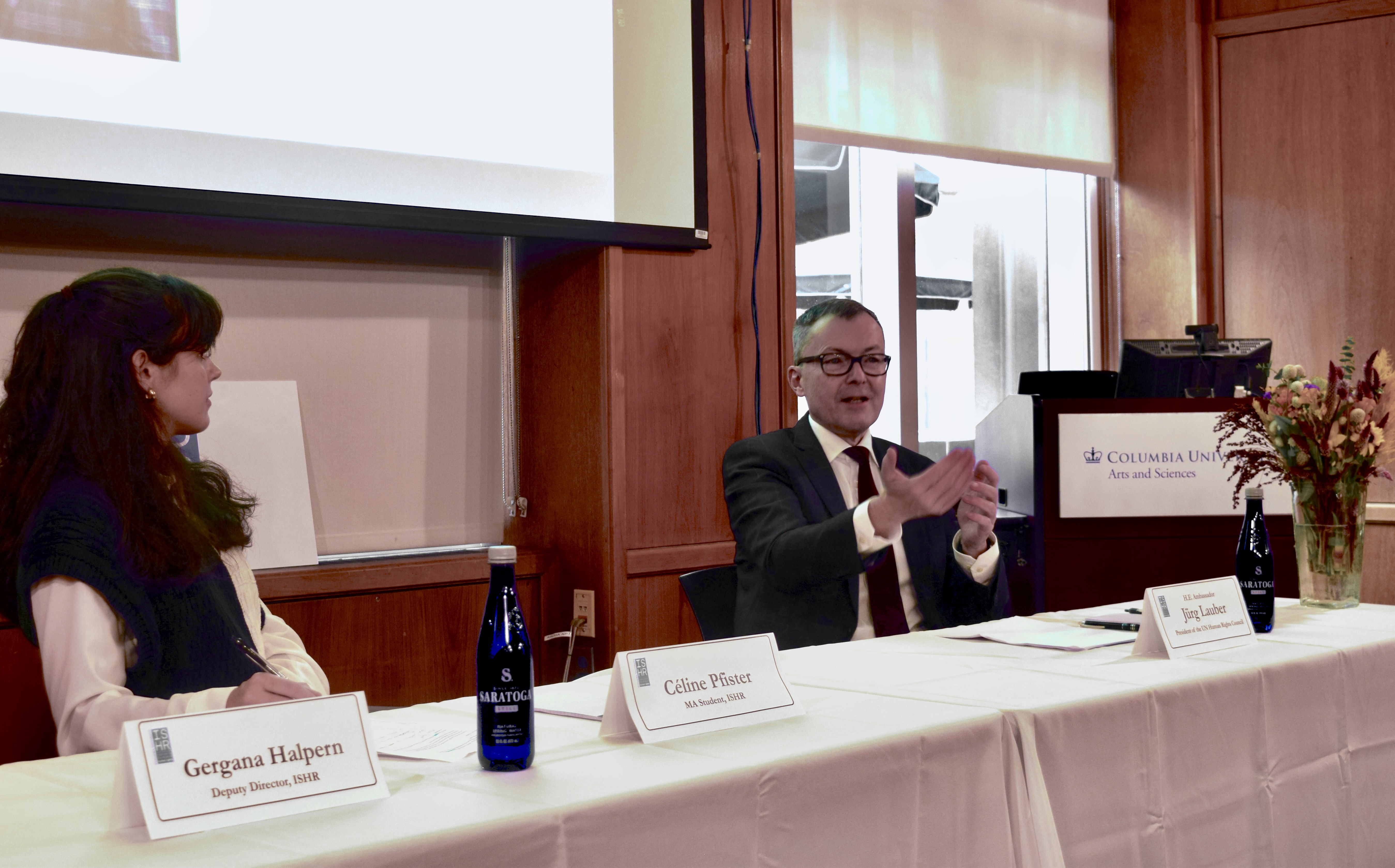 On Thursday, October 30th, the Institute for the Study of Human Rights hosted a conversation with H.E. Ambassador Jürg Lauber, President of the Human Rights Council and Permanent Representative of Switzerland to the United Nations in Geneva. The talk was moderated by Human Rights M.A. student, Céline Pfister. Gergana Halpern, ISHR Deputy Director, gave introductory remarks.